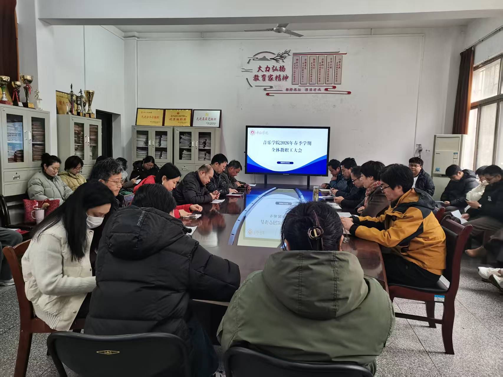 院长鲁勇传达学校2026年春季开学工作会议精神,要求全院紧跟学校发展步伐,不折不扣落实各项工作要求。针对学院2026年重点工作,他提出全新发展思路:一方面充分发挥春晖艺术团平台优势,积极对接企业、文化机构,争取资金与项目支持,深挖学院特色打造原创艺术作品,持续提升学院文化影响力;另一方面与韩国白石大学共建研究生导师联合工作站,通过开展学术交流、联合培养研究生,推动学科建设与国际接轨,为学院高质量发展开辟新路径、注入新活力。